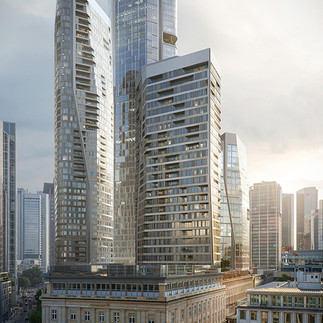 Among the numerous towers currently under construction or in planning in Frankfurt, the ensemble plays a prominent role. Despite the extreme density, the skyscrapers appear dynamic and elegant and offer building users a large field of vision from many vantage points as well as a high level of daylight penetration. The hexagonal floor plans are each rotated 90 degrees around the longitudinal axis. Vertical, building-height frames, folds, and the play of different materials within the facade give FOUR a unique visual impact.