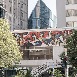 Berlin's Alexanderplatz is equally significant in terms of urban development, albeit for different reasons. Located on its northeastern periphery and built between 1970 and 1973, the "Haus des Berliner Verlages" - today's "Pressehaus am Alexanderplatz" - was long considered a candidate for demolition to make way for a ring of high-rise buildings planned since the 1990s. In 2015, however, the building designed by the Karl-Ernst Swora collective was placed under a preservation order, and between 2017 and 2021 it was extensively renovated and expanded with a new glass building. The ensemble also includes the 2-story former press café with the wall frieze "Die Presse als Organisator" (The Press as Organizer) by Willi Neubert, which was hidden under an advertising screen after reunification and uncovered during the refurbishment.