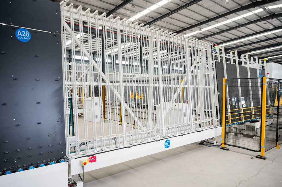 MAC-YUGONG has integrated a vertical sorting system that connects the tempering furnace directly to three IG lines. Powered by MACsoft, this intelligent system supports multi-line parallel operation—stably and efficiently—enabling optimized glass pairing, high-efficiency production, and finished product sorting.
